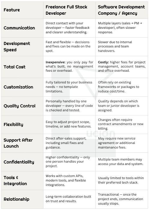 When deciding how to build your website or custom software, it often comes down to two options: hiring a freelance developer or engaging a software development company. Here’s a simple comparison to help you decide what fits your business best: